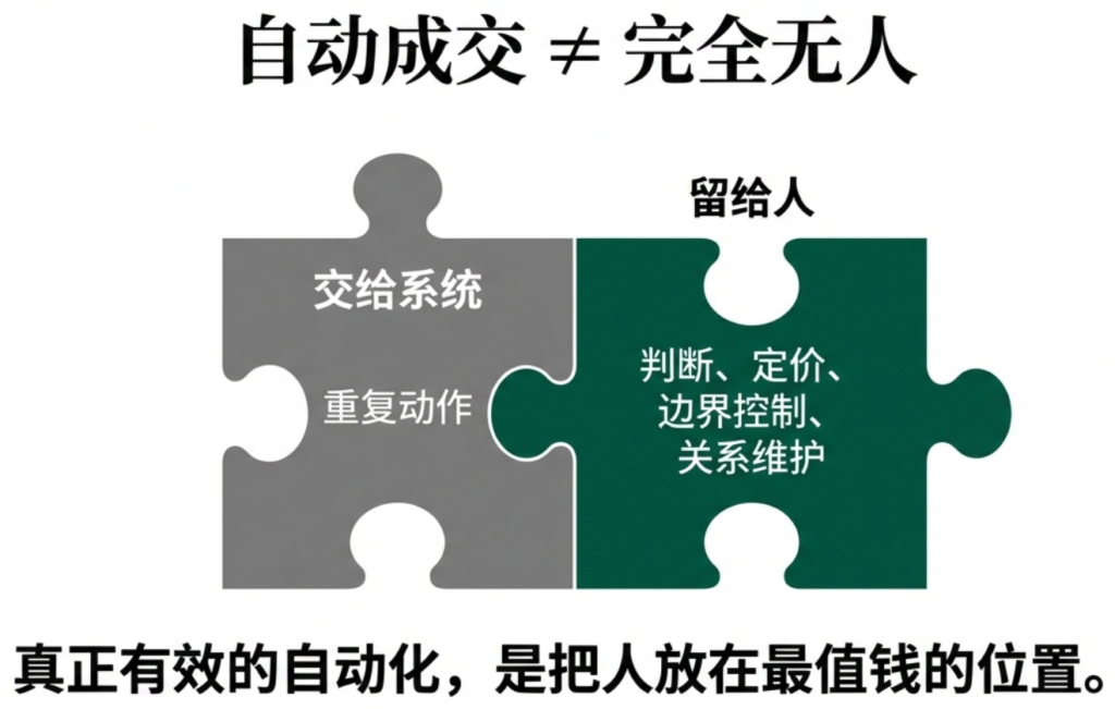 很多人看到“自动成交”会误解成“完全自动、完全无人”。这其实是另一个陷阱。真正有效的自动化不是把人完全拿掉,而是把人放在最值钱的位置:判断、定价、边界控制、关键关系维护。重复动作交给系统,关键决策留给人。