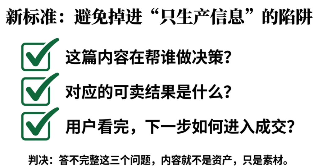 只要这三个问题答不完整,这篇内容就不是资产,只是素材。