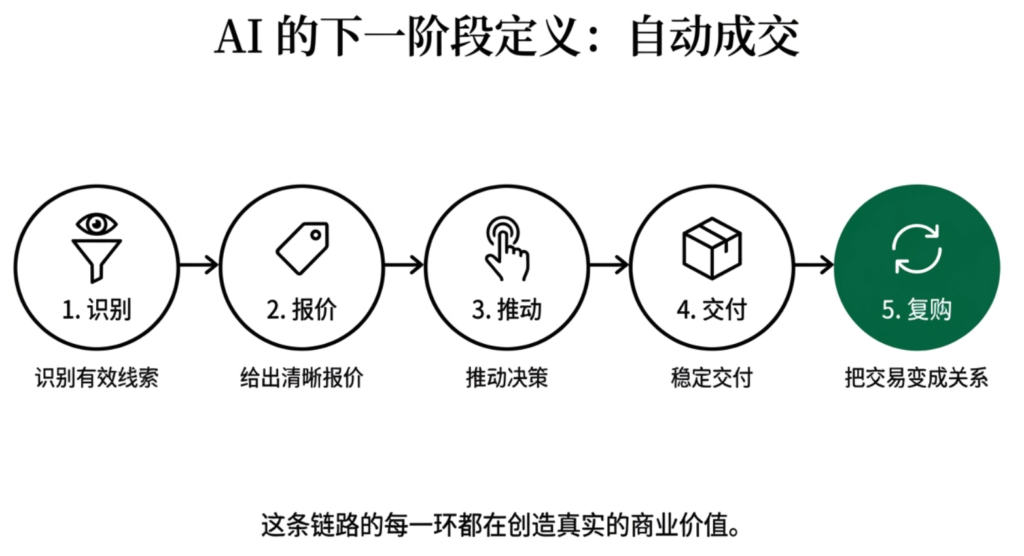 这也是为什么我会把“自动成交”定义为下一阶段最关键的 AI 能力: