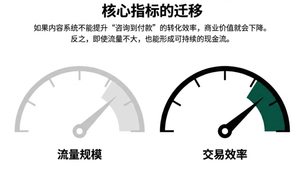 如果一套内容系统只能提升阅读量,却不能提升“咨询到付款”的转化效率,它的商业价值会持续下降。反过来,只要它能稳定提高成交率,即使流量不大,也能形成可持续的现金流。