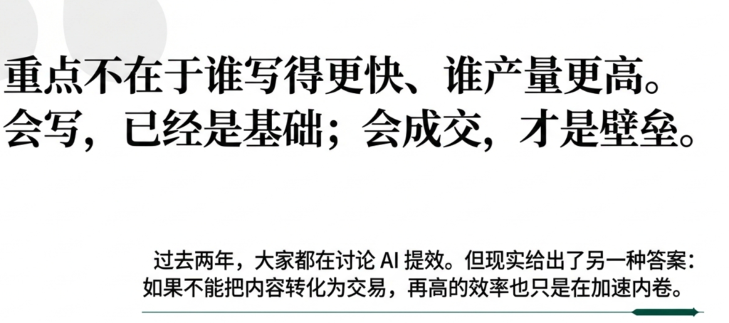 过去两年,大家都在讨论 AI 文案、AI内容、AI提效。谁写得快、谁产量高、谁模板多,似乎就更有竞争力。但现实正在给出另一种答案:会写,已经是基础;会成交,才是壁垒。