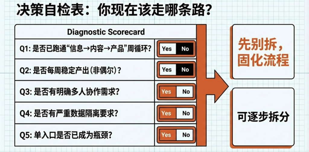 - 你是否已经稳定跑通“信息→内容→产品”的周循环?