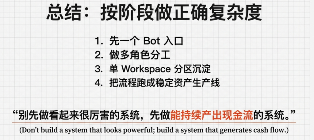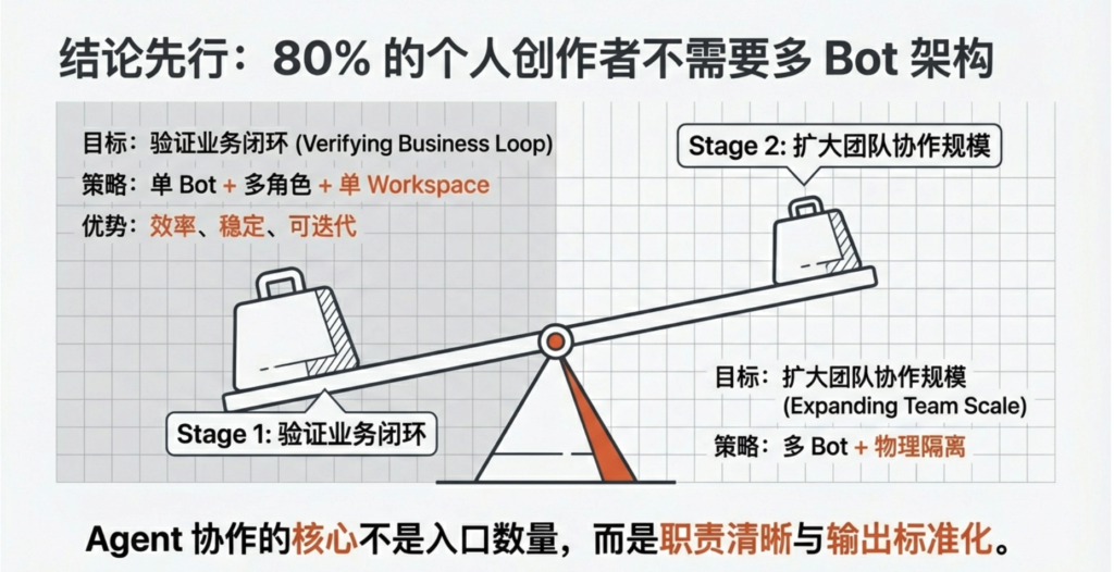 当隔离、并发、团队三大条件出现,再升级为多 Bot、多 Workspace。