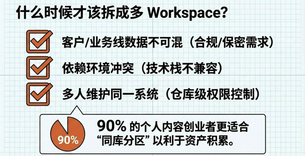 对于个人内容创业者来说,90% 情况下“同库分区”足够,而且更利于长期资产积累。