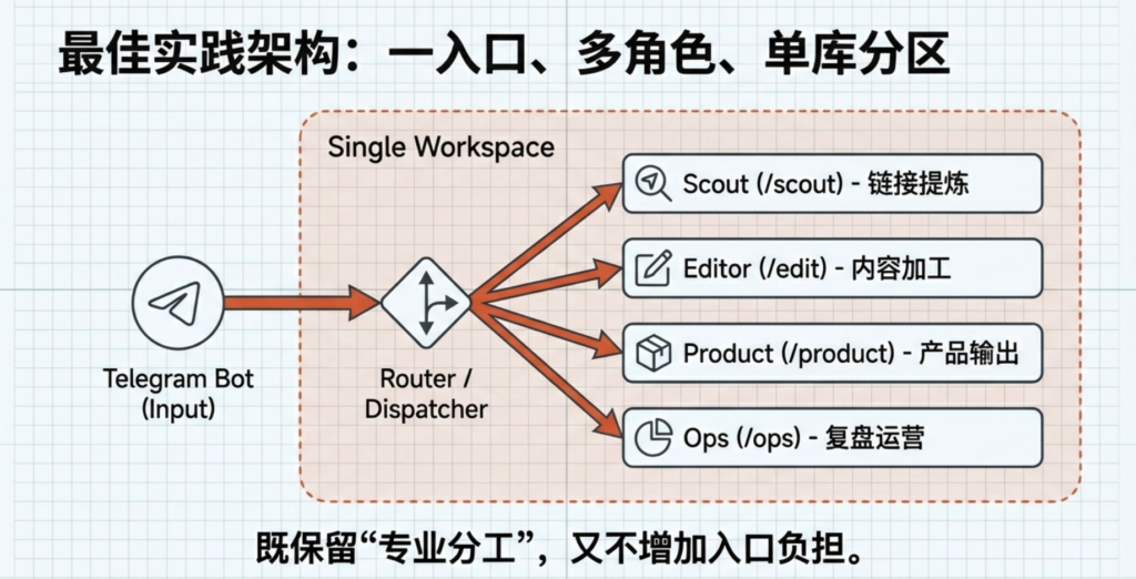 很多人会误以为“多 Agent = 多 Bot”,这是最常见的误解。Agent 协作的核心不是入口数量,而是职责清晰与输出标准化。你只有一个 Bot,一样可以完成 Scout(采集)→ Editor(加工)→ Product(产品化)→ Ops(复盘)的完整链路。