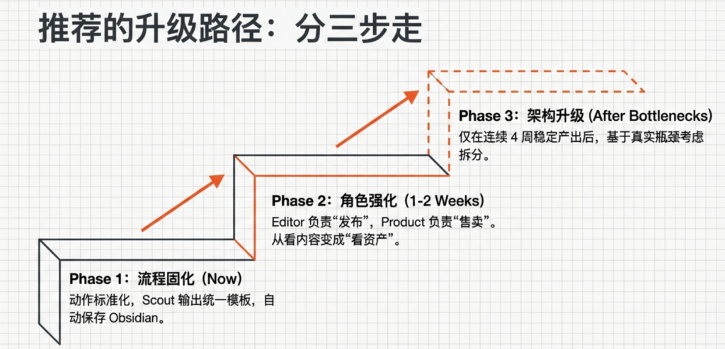 /scout 链接:只做信息提炼/edit 主题:只做内容加工/product 主题:只做产品化输出/ops 周报:只做复盘与清单