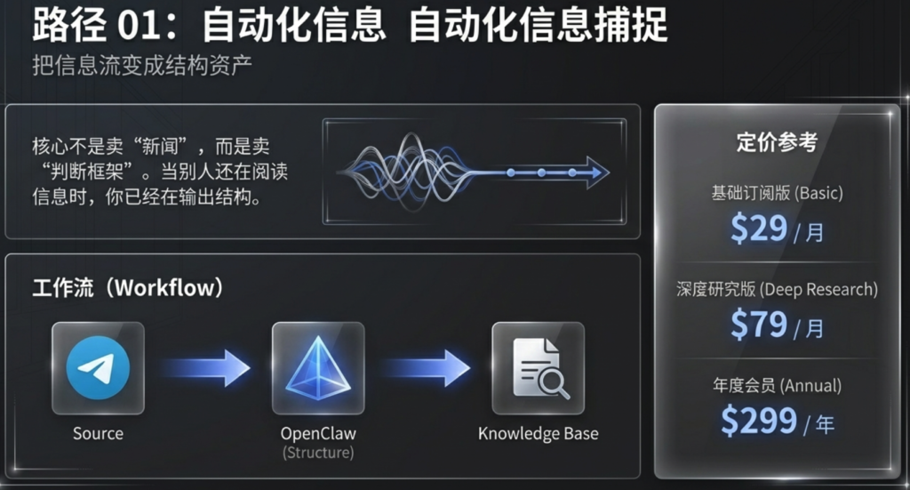 你卖的不是资料,而是结构与判断。自动化让你专注在价值最高的部分。