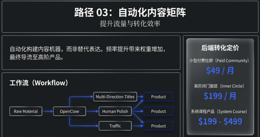 自动化本身不会带来收入,结构才会带来收入。OpenClaw 只是加速器,它可以让你更快整理信息、更快生成内容、更快设计产品,但真正决定结果的,是你是否把它嵌入进可扩展的盈利模型。