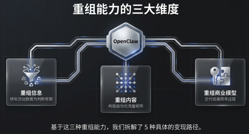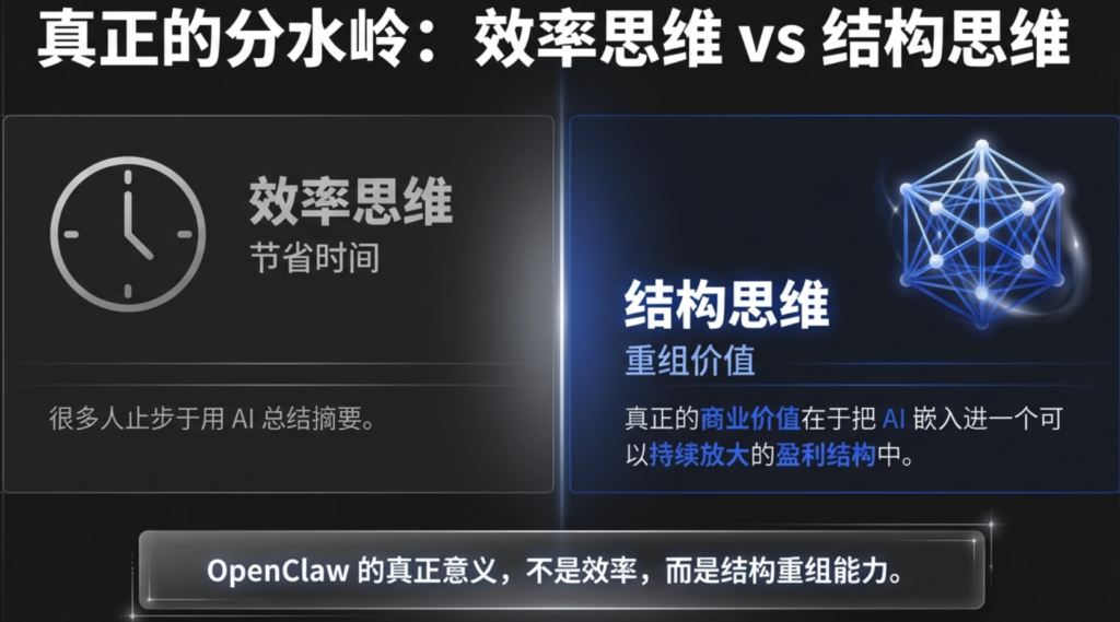 真正的分水岭,不在于你是否会用 AI,而在于你是否把 AI 嵌入进一个可以持续放大的盈利结构中。很多人安装了 OpenClaw,觉得总结能力强、理解能力好、记忆能力不错,但如果它只是帮你节省一点时间,那它的商业价值就被严重低估了。