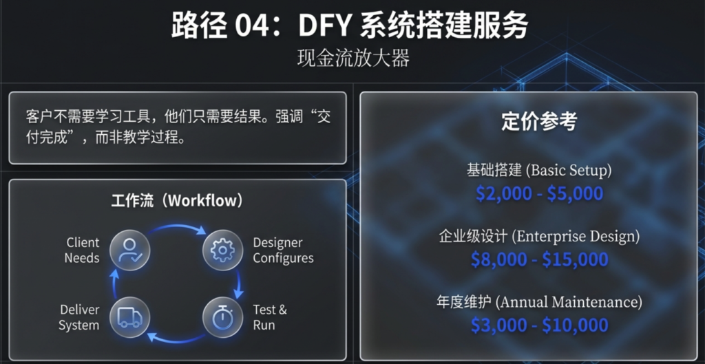 DFY 并不是最高级模式,它更像是现金流放大器。通过高单价项目,你可以快速获得资金与案例积累。