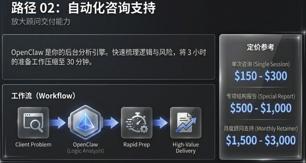 客户提出问题时,你可以让 OpenClaw 帮你快速梳理逻辑、风险点与决策路径,把原本需要三小时准备的材料压缩到三十分钟完成。这种效率优势可以直接转化为溢价能力。
